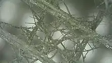 The glassy fibers that attach the sponge to the ocean floor, 5–20 centimetres (2–8 in) long and thin as human hair, are of interest to fiber optics researchers.[2][16] The sponge extracts silicic acid from seawater and converts it into silica, then forms it into an elaborate skeleton of glass fibers. Other sponges such as the orange puffball sponge (Tethya aurantium) can also produce glass biologically. The current manufacturing process for optical fibers requires high temperatures and produces a brittle fiber. A low-temperature process for creating and arranging such fibers, inspired by sponges, could offer more control over the optical properties of the fibers. These nano-structures are also potentially useful for the creation of more efficient, low-cost solar cells. Furthermore, its skeletal structure has inspired a new type of structural lattice with a higher strength to weight ratio than other diagonally reinforced square lattices used in engineering applications.[6][17]