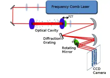 A simple realization of the Vernier spectroscopy setup has five basic components: a frequency comb, a scannable high finesse optical cavity, a diffraction grating, rotating mirror, and a CCD camera. The trace gas to be measured is put between the mirrors of the optical cavity to allow for optical path enhancement. The frequency comb is coupled into the resonator and made to form a Vernier ratio with the response function. The output of the cavity is reflected off a diffraction grating, providing angular separation of the frequency components of the beam. The diffracted beam is then reflected off the rotatable mirror and then focused onto the CCD camera. Three things must then happen in synchronization. The optical cavity scans through a free spectral range of the cavity while the rotating mirror simultaneously scans the direction perpendicular to the diffraction grating's diffraction plane. These two actions can be synchronized by means of a periodic ramp voltage which controls both the cavity scan (accomplished by a piezoelectric actuator) and mirror rotation (controlled by a stepper motor). If the CCD camera's exposure time is also set equal to the ramp voltage period, the resulting CCD image is a two dimensional matrix of approximately Gaussian peaks. In this manner, an entire spectrum is produced in the period of the ramp voltage. The time it takes to obtain a spectrum is limited by the cavity scan time, rotating mirror response, and minimum camera exposure time. This particular Vernier spectroscopy scheme is capable of producing an absorption spectrum of a trace gas (<1 ppmV) with tens of thousands of data points in less than a second.[2]