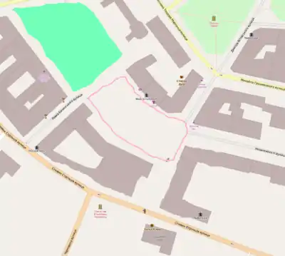 The square stretches from Halytska Street to Vitovsky Street. Vitovsky street connects the Viche Maidan with another city square - the Mickiewicz Square. Viche Maidan is a crossroad of many streets - Bachynsky Street, Belvederska Street, and the Nezalezhnist street. The first part of Nezalezhnist street is called stometrivka (Ukrainian: Стометрівка), which means "100-hundred-meters-street".[1] It is surrounded by numerous buildings such as the main post office, the Ukrtelecom building, the Passage of Gartenbergs, the business center "Kyiv", and many others. The square has couple of fountains, flowerbeds, and a small park.