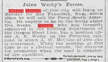 Salt Lake Tribune article on Morris's railroad clerical position to be taken in Peru