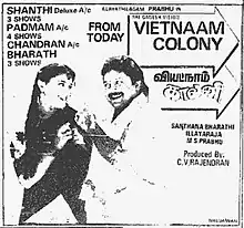 Vietnam Colony is a 1994 Indian Tamil-language comedy film directed and co-written by Santhana Bharathi. It is a remake of the 1992 Malayalam film of the same name which itself was based on the 1983 Scottish film Local Hero.[1][2] The film stars Prabhu, Goundamani and Vineetha. It revolves around two men trying to persuade some colony residents to relocate to another location for the sake of a corporate project, but the residents, and some goons, oppose them. Vietnam Colony was released on 15 July 1994.