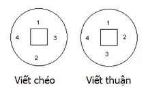 The inscriptions of Vietnamese cash coins can be written in either the Viết chéo (曰湥 / 曰袑, top-bottom-right-left) style or the Viết thuận (曰順, clockwise, top-right-bottom-left) style.[10]