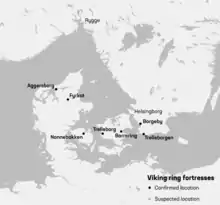 There are a total of seven known Viking ring fortresses at present, located in Denmark and Scania, Sweden. Many of them have been dated to the reign of Harold Bluetooth of Denmark, c. 980. Their exact purpose is subject to debate.