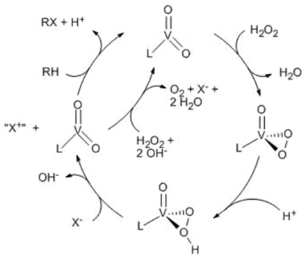 His group has interest in vanadium for bioinorganic applications. Vanadium can be naturally found in enzymes within certain marine animals. One of these enzyme types, nitrogenases, are responsible for converting nitrogen gas to ammonia and can then be accessed by plants, which is critical to their development.[16] The other type, haloperoxidases, takes bromine from seawater along with hydrogen peroxide and converts them into organobromine compounds.[17] These unique vanadium complexes, as well as others are found in some terrestrial beings such as mushrooms. Additionally, these compounds may provide very useful for humans as they have been found to help people with diabetes by improving glucose control.[18] The Pecoraro group has taken these interesting applications of vanadium and started research to more fully understand them. In particular, the haloperoxidases have been a main focus on research. First, the group synthesized vanadium complexes to mock the vanadium haloperoxidases in order to gain an understanding of the mechanism. Not only did their system efficiently catalyze the reaction, but they were also able to collect valuable kinetic data and come up with a proposed catalytic cycle as seen below.[19] The information showed that an acid/base was necessary for catalysis to occur. With this information in hand, efforts are underway to understand how these complexes are activated naturally to allow halide oxidation.[20] Also, they are working to understand the structures of the inactive forms of these vanadium based haloperoxidases.[1] This information will provide significant insight into how these vanadium haloperoxidases are found and operate in these biological systems, which will in turn take the group one step closer to being able to apply vanadium compounds to diabetes treatment.