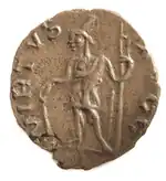 The deity was represented in a variety of ways, for example, on the coins of Tetricus, they could appear as a matron, an old man, or a young man, with a javelin, battle helmet, or only clothed in a cape. Within the realm of funerary reliefs Virtus is never shown without a male companion.[2] Often their presence within this realm of art is to compliment and provide assistance to the protagonist of the relief during a scene of intense masculinity or bravery.[3]