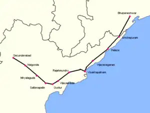 The train runs from Secunderabad via Nalgonda, Miryalaguda, Nadikudi, Piduguralla, Sattenapalle Guntur Junction, Vijayawada, Gudivada, Kaikaluru, Akividu, Bhimavaram Town, Tanuku, Nidadavolu, Rajahmundry, Samalkot, Annavaram, Tuni, Elamanchili, Anakapalle, Duvvada, Visakhapatnam, Simhachalam, Kothavalasa, Vizianagaram, Eheepurupalli, Ponduru, Srikakulam Road, Tilaru, Kotabommali, Naupada, Palasa, Sompeta, Ichchapuram, Brahmapur, Chhatrapur, Balugaon, Nirakarpur, and Khurda Road to Bhubaneswar.