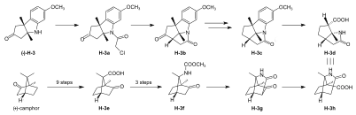Synthesis of the ring-A precursor ![]() Figure 8: Harvard synthesis of the A-D-components: ring A Starting point for the synthesis of the ring-A precursor was methoxydimethyl-indol H-1 synthesized by condensation of the Schiff base from m-anisidine and acetoin. Reaction with the Grignard reagent of propargyl iodide gave racemic propargyl indolenine rac-H-2; ring closure to the aminoketone rac-H-3 was brought about by BF3 and HgO in MeOH through intermediate rac-H-2a (electrophilic addition) with the two methyl groups forced into a cis-relationship by kinetic as well as thermodynamic reasons.[1]: 521-522 ![]() Figure 9: Harvard synthesis of the A-D-components: ring A resolution Resolution of the racemic aminoketone into the two enantiomers. Reaction of rac-H-3 with (−)-ethyl isocyanate permitted isolation by crystallization of one of the two diastereomeric urea derivatives formed (the other does not crystallize). Treatment of racemic ketone rac-H-3 (or of mother liquors from the previous crystallization) with (+)-ethyl isocyanate gave the enantiomer of the first urea derivative. Pyrolytic decomposition of each of these urea derivatives led to enantiopure aminoketones, the desired (+)-H-3, and (−)-H-3.[1]: 524-525 The "unnatural" (−)-enantiomer (−)-H-3 was used to determine the absolute configuration; in various later steps, (−)-H-3 and enantio-intermediates derived from it were used as model compounds in exploratory experiments.[38]: 173 Woodward wrote regarding the unnatural enantiomer "our experience has been such that this is just about the only kind of model study which we regard as wholly reliable".[1]: 529 ![]() Figure 10: Harvard synthesis of the A-D-components: Ring A determination of configuration Determination of the absolute configuration of ring-A precursor (+)-H-3. For this determination, the levo-rotatory ("unnatural") enantiomer of aminoketone (−)-H-3 was used in order to save precious material: Acylation of the amino group of (−)-H-3 with chloroacetyl chloride, followed by treatment of the product H-3a with potassium t-butoxide in t-butanol, afforded tetracyclic keto-lactame H-3b. Its keto carbonyl was converted to a methylene group by desulfurization of the dithioketal of H-3b with Raney nickel to give lactam H-3c. Destruction of the aromatic ring by ozonolysis, involving the loss of a carboxyl function by spontaneous decarboxylation, led to bicyclic lactam-carboxylic acid H-3d. This material was identified with a product H-3h derived from (+)-camphor, possessing the same constitution and the absolute configuration as shown in formula H-3d.[1]: 525-526 The material for this identification of H-3d was synthesized from (+)-camphor as follows: cis-isoketopinic acid H-3e, obtained from (+)-camphor by an established route described in the literature,[70] was converted via the corresponding chloride, azide, and isocyanate to methyl-urethane H-3f. When treated with potassium t-butoxide in t-butanol and subsequently with KOH, H-3f was converted to H-3h, clearly by way of the intermediate H-3g. The identity of the two samples of H-3d and H-3h obtained by the two routes described, established the absolute configuration of (+)-H-3, the enantiomer of the ring-A precursor.[1]: 525-526 Synthesis of the ring-D precursor from (-)-camphor ![]() Figure 11: Harvard synthesis of the A-D-components: ring D from (-)-camphor (−)-Camphor was nitrosated in the α-position of the carbonyl group to give oxime H-4, Beckmann cleavage afforded via the corresponding nitrile the amide H-5. Hofmann degradation via an intermediary amine and its ring closure led to lactam H-6. Conversion of its N-nitroso derivative H-7 gave diazo compound H-8. Thermal decomposition of H-8 induced methyl migration to give cyclopentene H-9. Reduction to H-10 (LiAlH4), oxidation (chromic acid) to aldehyde H-11, Wittig reaction (carbomethoxymethylenetriphenylphosphorane) to H-12 and hydrolysis of the ester group finally gave trans-carboxylic acid H-13.[1]: 527-528 [note 14] Coupling of ring-A and ring-D precursors to "pentacyclenone" ![]() Figure 12: Harvard synthesis of the A-D-components: coupling of rings A and D to "pentacylenone" N-acylation of tricyclic aminoketone (+)-H-3 with the chloride H-14 of carboxylic acid H-13 gave amide H-15, which on treatment with potassium t-butoxide in t-butanol stereoselectively produced pentacyclic keto-lactam H-16 via an intramolecular Michael reaction which directs the indicated hydrogen atoms in trans relationship to each other. In anticipation of the Birch reduction of the aromatic ring, protective groups for the two carbonyl functions of H-16 were required, one for the ketone carbonyl group as ketal H-17, and the other for the lactam carbonyl as the highly sensitive enol ether H-20. The latter protection was achieved by treatment of H-17 with Meerwein salt (triethyloxonium tetrafluoroborate) to give iminium salt H-18, followed by conversion to orthoamide H-19 (NaOMe/MeOH), and finally expelling one molecule of methanol by heating in toluene. Birch reduction of H-20 (lithium in liquid ammonia, t-butanol, THF) provided tetraene H-21. Treatment with acid under carefully controlled conditions led first to an intermediate dione with the double bond in β,γ position which moved to the conjugated position in dione H-22, dubbed pentacyclenone.[1]: 528-531 [14]: 5 From "pentacyclenone" to "corrnorsterone" ![]() Figure 13: Harvard synthesis of the A-D-components: from "pentacylenone" to "corrnorsterone" The ethylene ketal protecting group in pentacyclenone H-22 was converted to the ketone group of H-23 by acid-catalyzed hydrolysis.[1]: 531 The dioxime primarily formed by reaction of diketone H-23 with hydroxylammonium chloride was regioselectively hydrolysed (nitrous acid/acetic acid) to the desired mono-oxime H-24. This is the oxime of the sterically more hindered ketone group, the nitrogen atom of which is destined to become the nitrogen of the target molecule's ring D. Cruc