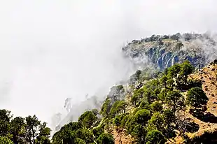 The second route is from the Mexican side, from El Carmen, Talismán bridge, Cacahoatán, and Unión Juárez by vehicle, and from there on foot.[6] This route crosses into Guatemala and has been described as one of the most interesting hikes in Central America, leading up winding paths through lush rainforests, subsistence farming villages, up ancient magma flows, and rock-filled temperate forests before reaching the top of the lowest caldera. From there the final stretch to the summit provides panoramic views high above the clouds as the tree-line gradually diminishes with altitude. Several major volcanos within the Central American Volcanic Arch including Tajumulco are visible from the summit.