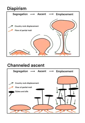 A diapir forms when a blob of buoyant, hot, and ductile magma ascends to a higher lithospheric layer.[11] Diapirism is considered as the main mechanism of magma transport in lower to middle crust[2] and it is one of the viable transportation mechanisms for both felsic and mafic magmas.[11]