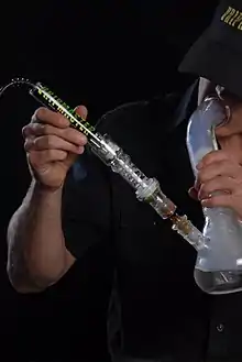 Cannabis is also consumed via the vaporization of cannabis concentrates or oils that have been extracted from the plant, commonly referred to as "dabbing". Users typically employ a torch to heat a small cup shaped quartz or titanium attachment on a bong before dabbing the oil onto the heated surface and inhaling the vapors through the bong.[11] This route of consumption is generally much more potent than smoking or vaporizing marijuana flower due to the increased concentration of cannabinoids. Users typically report that the effects of dabbing are much more intense than regular cannabis, while also being shorter lived.[12]