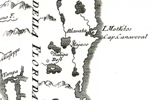 The indigenous Mayaca people inhabited much of the area now known as Volusia County along the St. Johns River. A settlement just south of current-day Lake George was known as Maiaca (or Mayaca) and it was likely the largest of the Mayaca villages.[6] Historical sources frequently refer to the native Timucua as having inhabited large areas of Florida, including areas along the St. Johns river. However, other sources posit that the Mayaca were a distinct group of people with their own language, customs and settlements. Alliances were formed among smaller native groups. The village of Mayaca (also spelled Mayarca) was identified as belonging to the Outina confederation at one point, and being allied with the Saltwater Timucua at another.[7]