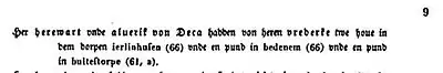 - ↑ Wilhelm von Hodenberg (ed.), Hoyer Urkundenbuch (Document book from Hoya), Hanover: 1855, 1. Abteilung (part) Hoyaer Hausarchiv (archive), Heft (booklet) IV: Hoyaer Lehne, 10. Haseldorfer Güter (estates from Haseldorf): pp. 8 and 9. on page 9 the first three lines cite a document of Herewart und Alverik von Deca, dated 1250/55 'her vredeke' is Frederick of Haseldorf; 'twe houe' are two farms; 'in den dorpen ierlinhusen' is in the village Ihlienworth 10 km south of Otterndorf; 'en pund' are dues; 'bedenem' is the village Belum northwest of Neuhaus (Oste); 'bultestrope (61,a)' means: see on p. XI 61) 'Zum Amte Neuhaus an der Oste: ... Bülsdorf is the oldest part of the village Neuhaus (Oste).