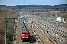 Freight train running to Stuttgart near the entrance of the new Vaihingen (Enz) station; high-speed line on the right