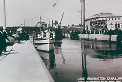 Dedication of the Hiram M. Chittenden Locks on 4 July 1917, showing the Swinomish in the background, from which the W.T. Preston was built.