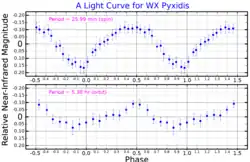 Near-infrared (J band) light curves for WX Pyxidis, showing variation over the white dwarf rotation period (top) and orbital period (bottom). Adapted from Joshi et al. (2011)[1]