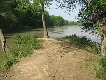 The river remains shallow and somewhat rocky with minor rapids until mile seventy-one near the community of Murray.[15] There the river becomes calm and deeper until mile eighty-one, due to the dam and levee at the town of Markle. The lock that was formerly at the site is abandoned and a narrow washout is the only means to bypass the dam. In the rocky washout the river level drops four feet, making it one of the most dangerous points on the river. Boaters are advised to exit the river and reembark on the other side of the dam rather than traverse the washout.[16]