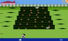 The player stands at the bottom of the screen and must throw eggs up at the rabbits before they steal the carrots.