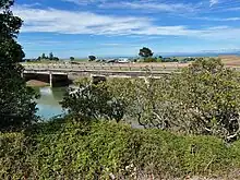 The first bridge over the river was built in 1885.[17] A single lane concrete bridge now carries SH25 over the river.[18]