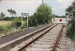 Following the withdrawal of passenger services in 1957, the line through Wainhill Crossing remained open until July 1990 for the purposes of coal, gypsum and cement movements to and from the Rugby Portland Cement Company's factory near Chinnor.[6] Negotiating Wainhill Crossing, by this time unstaffed, required trains to be brought to a halt by the crossing whilst a crew member opened and closed the gates; this was particularly awkward as the line descends at a 1 in 73 gradient here and was subject to a speed restriction of 5 mph.[7]