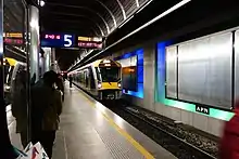 The station has five platforms and is constrained by the 9.3 m width of the 426 m long double-track access tunnel. Early forecasts predicted that while double-tracking of the surrounding rail network would improve peak time train congestion, the capacity of the corridor would not be reached until about 2020.[37] Growth in train patronage and increased services resulted in the tunnel being at maximum capacity from 2011, almost 10 years earlier than predicted.[38] Because of the capacity restrictions, a proposed Hamilton-Auckland commuter train service would have gone to The Strand Station some 1.5 km to the east.[39]