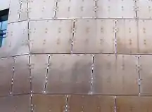 The architect's concept was a building that expressed "Welshness" and was instantly recognisable.[28] The building was designed to reflect many different parts of Wales with local Welsh materials that dominate its history: slate, metal, wood and glass.[29] Many of the materials used come from Wales, including 1,350 tonnes of Welsh slate. 300,000 concrete blocks and a million metres of electric cable were also used in construction.[30]
