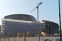 The original plans for the WMC were that it would have a concert hall,[57] but the final design of phase 1 did not include one. Instead, space was left for a concert hall to be built after phase 1 opened in 2004, and construction on phase 2 was then due to begin early in 2005.[58] However, phase 2 construction did not actually begin until April 2007.[59] Phase 2 was designed to fit into the WMC's curved slate frontage, with an upper part constructed from timber.[57]