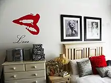 A wall decal, also known as a wall sticker, wall tattoo, or wall vinyl, is a vinyl sticker that is affixed to a wall or other smooth surface for decoration and informational purposes. Wall decals are cut with vinyl cutting machines. Most decals use only one color, but some may have various images printed upon them.