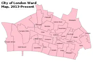 The wards are a survival of the medieval governmental system that allowed very small areas to exist as self-governing units within the wider city.[1] They are both electoral/political sub-divisions and permanent ceremonial, geographic and administrative entities within the city. They had their boundaries changed in 2003, and to a lesser extent in 2013, though the number of wards and their names did not change.