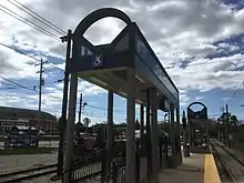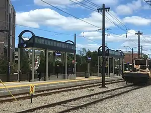 Warrensville–Van Aken station (signed as Warrensville) is a station on the RTA light rail Blue Line in Shaker Heights, Ohio. It is the eastern terminus of the Blue Line. Unlike most of the stations in Shaker Heights, Warrensville–Van Aken is located off street, not in the median of Van Aken Boulevard. It is located in a block surrounded by Chagrin Boulevard (U.S. Route 422), Van Aken Boulevard, and Northfield Road (Ohio State Route 8) and Tuttle Road in the midst of a dense retail/commercial area. The station is located one block west of Warrensville Center Road, after which it named.