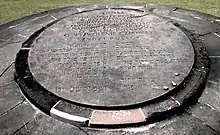 The decision to build a monument to the ghetto partisans was made as early as in 1944, by the Central Committee of Polish Jews in Lublin.[1][2] The monument was designed by Leon Suzin.[1][2] The first part of the monument, a small memorial tablet, was unveiled on April 16, 1946; the plaque was in the shape of a circle, with a palm leaf, a Hebrew letter "B" ב, and a Hebrew, Polish and Yiddish inscription: "For those who fell in an unprecedented and heroic struggle for the dignity and freedom of the Jewish people, for a free Poland, and for the liberation of mankind. Polish Jews".[1][2] It was also decided to build a larger monument in the future.[2]