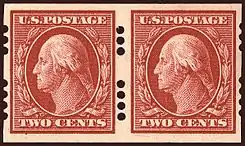 This first Washington–Franklin issue appeared with gauge 12 perforation and was printed on paper having a double-line watermark consisting of the letters USPS embedded in the fibers.[3] This particular watermark had large double-lined letters which often weakened the sheets of stamps, causing the frequent separation of stamps at the Post Office before they even reached the customers. As a result, the double-line watermark was discontinued in 1910 and replaced by a single line watermark with smaller letters. Because of the high demand for the one and two cents denominations, these issues were also printed in booklet form, with six stamps to a page.[3]