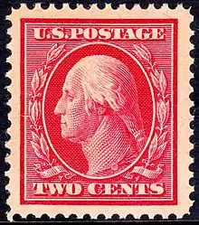 The first Washington–Franklin stamp issued was a two-cent red Washington-head, issued on November 16, 1908, to pay the first class postage on a standard letter.[6] The seven separate and distinct Washington–Franklin series appeared at intervals of a year or two and included denominations that ranged from 1-cent to 1 or 5 dollars, depending on the series. The different issues can be distinguished from one another by one or more of several factors: perforation gauge, the type of stamp paper—or, in some unusual varieties, by the printing method used. Four or five basic paper-types were employed during the life of the issue. Two of these have different watermarks (consisting of single-line and double line letters: 'USPS'), while another paper-type had no watermarks (watermarks are detected by placing the stamp in a special fluid). In 1909 a much less common type of bluish paper was used, made of 35% rag stock combined with the usual wood pulp and can readily be identified by its faint bluish-gray color.[3] (N. B., Some contend that bluish paper contained only 10% rag stock.[7]) Later in the same year the Post Office is supposed to have experimented with China clay paper, but whether such a paper stock actually existed has become a matter of dispute.[8]