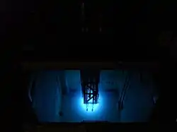 Like many TRIGA reactors, the WSUR has the ability to pulse. Ordinarily the WSUR runs at a steady state power level of 1MW, however because of the unique characteristics of TRIGA fuel it can be pulsed to approximately 1000 times this power for a very short amount of time.[5] This ability is due to the fact that TRIGA fuel is designed with a prompt negative temperature coefficient of reactivity, which means that as the fuel heats up, it becomes less and less reactive (it shuts itself down). So when one of the control elements (known as the transient rod) is ejected from the core via air pressure at high speeds, the reactor jumps in power from ~80 watts to over a 1 billion watts and back down again in 50 milliseconds,[5] causing a bright blue flash of Cerenkov radiation.[1] There is a video of this effect on the WSUNSC webpage (see references).