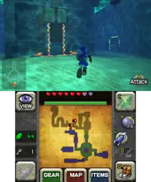 The Water Temple originally appeared in the 1998 Nintendo 64 video game The Legend of Zelda: Ocarina of Time. It is one of the levels that the protagonist Link explores as an adult.[1] The temple was constructed to worship water spirits and was guarded by Zoras.[2] It is found in Lake Hylia, which is at the time cursed by antagonist Ganondorf and an entity in the Water Temple.[2][1] The dungeon is located underneath Lake Hylia and is a large, multi-leveled dungeon. Players raise and lower the water level in wings of the dungeon to access new areas.[2] Link utilizes equipment to navigate the dungeon, including Iron Boots, a tunic that allows him to breathe underwater, and a Hookshot to hook onto distant objects.[2][3] Link battles his alter-ego Dark Link in the Room of Illusion, which features shallow water and a lone tree on a patch of land.[4] At the end, Link faces the dungeon's master, Morpha, a large water amoeba creature.[4] Upon its defeat, Link warps to the Chamber of Sages, where the Sage of Water, Princess Ruto, bestows onto him the Water Medallion. Afterwards, Lake Hylia returns to normal. Another version of Ocarina of Time was released called The Legend of Zelda: Ocarina of Time Master Quest, which features harder versions of each dungeon, including the Water Temple.[1] Game director Eiji Aonuma cited his love for deep-sea diving as his inspiration for the Water Temple, utilizing diving-based puzzles to reflect this.[5]
