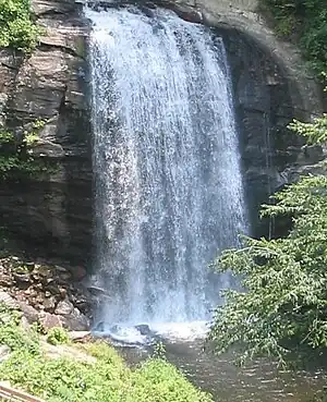 The waterfalls of North Carolina, U.S.A., are a prominent feature of the geography of the Piedmont and mountain regions of the state, as well as a major focus of tourism and outdoor recreation. Many of these falls are located in state parks, national forests, wildlife management areas, and other public lands, as well as private property. Many are accessible via established hiking trails, and some developed areas include boardwalks, observation platforms, picnic areas, and other amenities. Some of the highest and most voluminous waterfalls in the eastern United States are located in North Carolina.