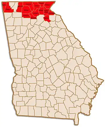 The waterfalls of northern Georgia, U.S., are a prominent feature of the geography of that region, as well as a major focus of tourism and outdoor recreation. Many are located in state parks, national forests, wildlife management areas, and other public lands. Many are accessible—with varying degrees of ease or difficulty—via established hiking trails, and some developed areas include boardwalks, observation platforms, picnic areas, and other amenities. The Cherokee called this region "Land of a Thousand Waterfalls".[1] The third-, fourth-, and fifth-highest waterfalls in the eastern United States are located in northern Georgia.