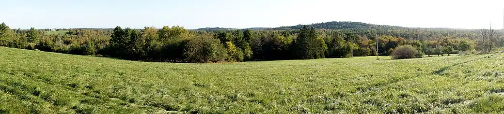 On the horizon is the original drumlin cleared by George "Michael" Wile and his wife Lucinda "Lucy" Hirtle. This hill is the one Lucy refers to from the early days of the settlement when she speaks of spreading a quilt between the stumps to place her basket of children on, and then another quilt above them for shade, when she was "reaping and doing other work".