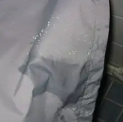 Waterproof fabrics are fabrics that are, inherently, or have been treated to become, resistant to penetration by water and wetting. The term "waterproof" refers to conformance to a governing specification[1] and specific conditions of a laboratory test method. They are usually natural or synthetic fabrics that are laminated or coated with a waterproofing material such as wax, rubber, polyvinyl chloride (PVC), polyurethane (PU), silicone elastomer, or fluoropolymers. Treatment could be either of the fabric during manufacture or of completed products after manufacture, for instance by a waterproofing spray. Examples include the rubberized fabric used in Mackintosh jackets, sauna suits, and inflatable boats.