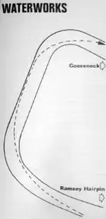 - ↑ TT Racing, by Ray Knight, p.53. "...the first view of the double right hand cornered Waterworks section looks tight and the steep drop over the bank is detuning,...". 1974 Speedsport Motobooks, Brentford, England. ISBN 0-85113-078-X Accessed 22 December 2015
