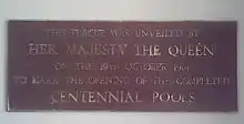 In 1981, this plaque was unveiled by Queen Elizabeth II at the Centennial Pools.