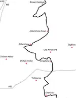 The footpath approximates an ancient route that might have been used by drovers taking cattle for export. It passes through the towns of New Alresford, Droxford, Hambledon, Havant and Emsworth and the villages of North Oakley, Deane, Dummer, Brown Candover, Abbotstone, Cheriton, Hinton Ampner, Kilmeston, Soberton, and Denmead.