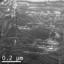 The main advantage of using WBDF is the ability to acquire high-contrast images of imperfect specimens for the purpose of studying defects in the material. This technique is not overly complex in its setup and can provide additional quantitative data for imaging a sample via TEM. Some examples of this include higher contrast images of thickness fringes, strain fields, and dissociated dislocations.[1] For example, Feng et al. were able to use WBDF to show waveform contours in a barium titanate sample which demonstrated that strain contours were dependent on the stress state.[15] The bright field images did not clearly show the strain field, while the WBDF was able to clearly show a pattern indicative of strain. In another example, Rakhmonov et al. used WBDF to study how dislocations interact with precipitates in an Al-Cu-Mn-Zr alloy crept at 300 °C, and they observed Orowan loops around precipitates.[16]