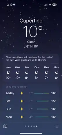 Weather is a weather forecast app developed by Apple Inc., available on iOS since the release of the iPhone and iPhone OS 1 in 2007.[1][2] It allows users to see the conditions, forecast, temperature, and other related metrics of the device's current location, as well as a number of other cities. A version of Weather is also available for watchOS; however, it is limited in functionality.[3] Weather was made available on more devices across the Apple ecosystem with the releases of iPadOS 16 and macOS Ventura, where weather data from Apple was previously only available as a widget or through Siri.