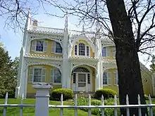 Once called the "most photographed house in the state" of Maine,[1] the Wedding Cake House, known formally as the George W. Bourne House, is a historic house located at 104 Summer Street in Kennebunk, Maine. The home was built in 1825 by shipbuilder George W. Bourne (1801–1856), who later built a frame barn which he connected to the main house with a carriage house. In 1852, the barn caught fire and the carriage house was demolished to keep the fire from spreading to the house. Bourne, who during a European tour had been impressed by the Gothic beauty of the cathedral at Milan, rebuilt the carriage house and barn in what later came to be known as Carpenter Gothic style. Using hand tools, he crafted five buttresses with pinnacles on top of each. Then in order to tie the new structures in with the existing house, he added six buttresses with pinnacles to the house and then joined them together with intricate woodwork. His only help in doing this was Thomas Durrell, an apprentice ship's carpenter. Bourne spent the rest of his life adding to these embellishments.[2] It has been said of Bourne: "The highly skilled carpenter knew no limits to his skill."[3]