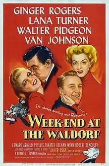 Week-End at the Waldorf, an American comedy drama film starring Ginger Rogers, Lana Turner, Walter Pidgeon, and Van Johnson. Directed by Robert Z. Leonard, its Samuel and Bella Spewack screenplay is based on playwright Guy Bolton's stage adaptation of the 1929 Vicki Baum novel Grand Hotel, which had been filmed as a straight drama as Grand Hotel in 1932.