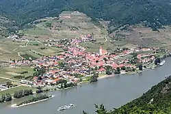 Weißenkirchen in der Wachau is a town in the district of Krems-Land in the Austrian state of Lower Austria. The ferry across the Danube here is interesting in that it has no motor or sail: it is powered by rudder set against the river current, anchored to a cable above the river. The ferry carries passengers, bicycles, motorcycles, and automobiles.