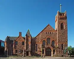 The Wesley United Methodist Church (formerly the Wesley Methodist Episcopal Church) building was constructed of granite, stone, brick, and sandstone in Richardsonian Romanesque style, featuring round-arched windows and multiple towers. When built, the building was in the residential neighborhood of Loring Park at 101 Grant Street East; it was built during Minneapolis' building boom in the last decade of the 19th century.[3] Architect Warren H. Hayes (1847–1899) was Minneapolis' leading designer of churches in the 19th century, having designed the Calvary Baptist Church, Fowler Methodist Episcopal Church, and the First Congregational Church, as well as the Central Presbyterian Church in Saint Paul.[4] Today the location is overwhelmed by the neighboring Minneapolis Convention Center.