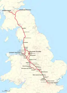The spine[9] has bypasses serving the major towns and cities of Northampton, Coventry, Birmingham and Wolverhampton. Spurs serve Stoke-on-Trent, Macclesfield, Stockport, Manchester, Runcorn and Liverpool. There is also a branch to Edinburgh, at Carstairs in Scotland which is rarely used as it is not the most direct route between London and Edinburgh.[10] It provides a direct connection between the WCML and the East Coast Main Line.
