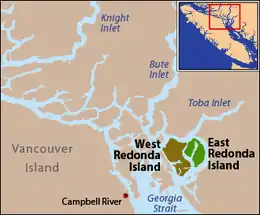 West Redonda Island is located west of East Redonda Island, northeast of Cortes Island, southeast of Raza Island, and south of the mainland between Toba Inlet and Bute Inlet within Electoral Area C of the Strathcona Regional District.