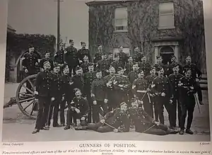 In 1859, as the United Kingdom feared invasion from the continent, the government reluctantly accepted the creation of many Rifle, Artillery and Engineer Volunteer Corps composed of part-time soldiers eager to supplement the Regular British Army in time of need.[1][2] The Secretary of State for War allowed the Artillery Volunteer Corps (AVCs) free access to guns and ammunition for practice.[3] Most of the AVCs were formed in the coastal counties to man fixed coast defence guns but the following corps were raised in the inland West Riding of Yorkshire:[4][5][6]